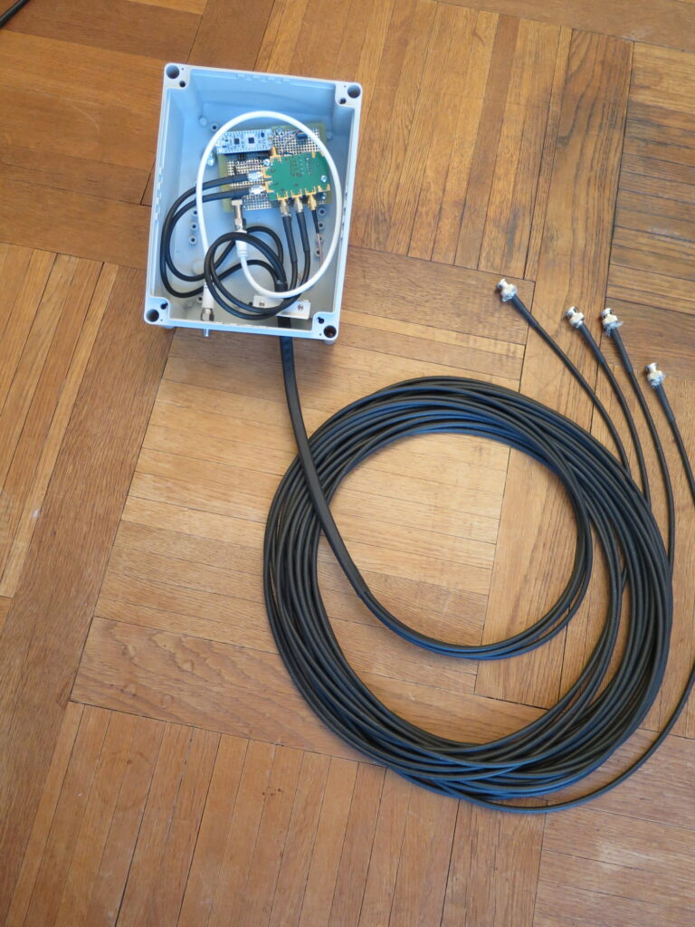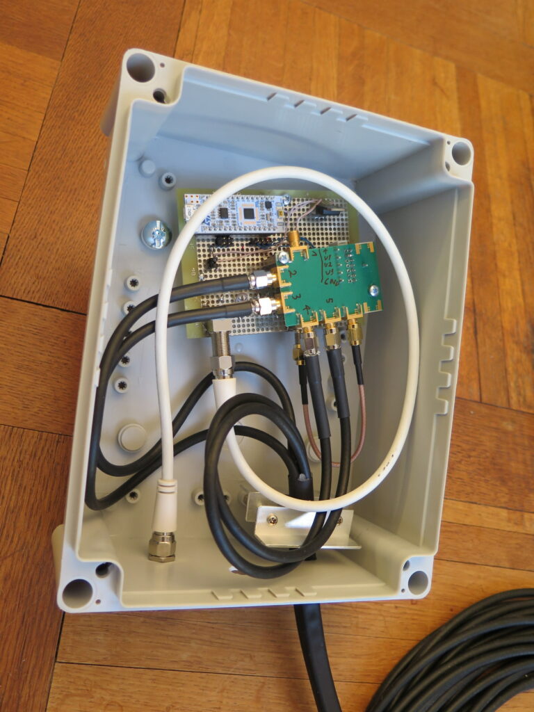1) un commutateur d’antenne électronique (actuellement ADRF5250), piloté par un microcontroleur, avec préampli RX, dans boitier étanche plastique, voir photos. Il commute périodiquement entre les 4 ou 5 antennes disponibles, selon un cycle prédéfini, de quelques millisecondes. Dans le cycle, une des période commute volontairement sur « rien », pour que le soft puisse se synchroniser, et puisse identifier le début d’un nouveau cycle.